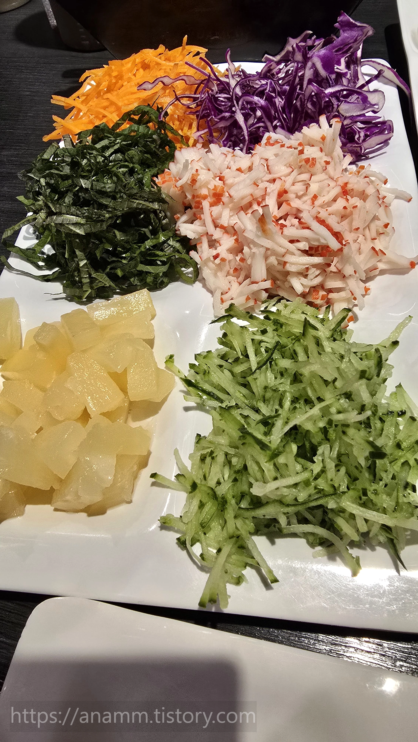 - 월남쌈용 채소: 깻잎, 양파, 맛살, 파인애플, 새싹채소 등